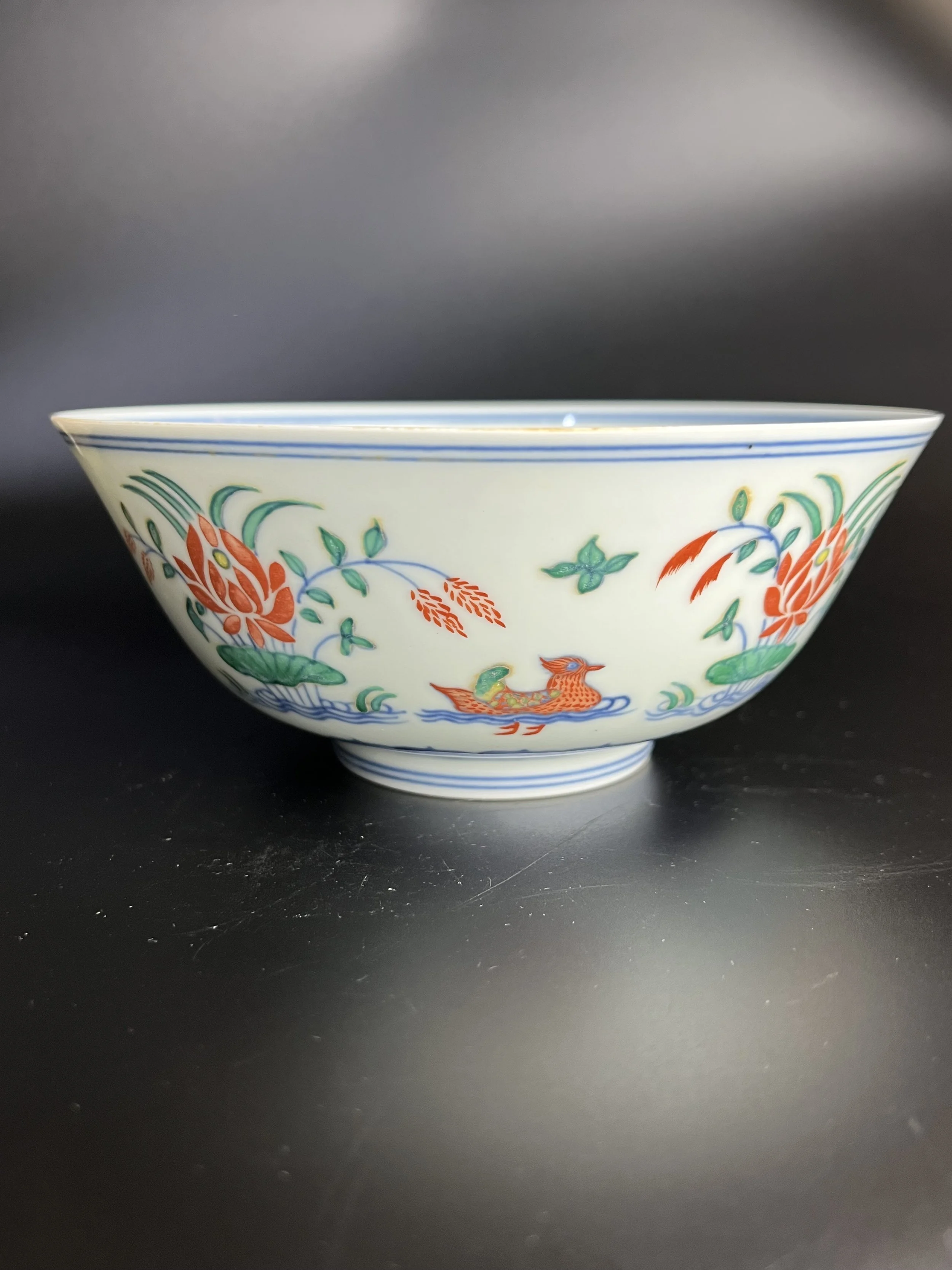 碗型优雅,口沿微敞,弧壁流畅,下承圈足,比例匀停,胎体轻薄透光,迎光视之,莹润如玉,体现了“成化无大器”时代对精巧之美的极致追求。其核心价值在于斗彩工艺的登峰造极:工匠先以淡雅恬静的国产平等青料勾画池塘荷叶、水草、 perhaps 鸳鸯或翠鸟的轮廓,罩釉高温烧成后,再于釉上精准填绘姹紫、娇黄、油红、翠绿等矿物彩料,复入彩炉低温焙烧。釉下青花的清丽与釉上彩的鲜妍相互映衬,画面呈色丰富而柔和,尤其是那独具时代特征、如熟赤铁般的“姹紫”彩,后世难仿,成为鉴识关键。