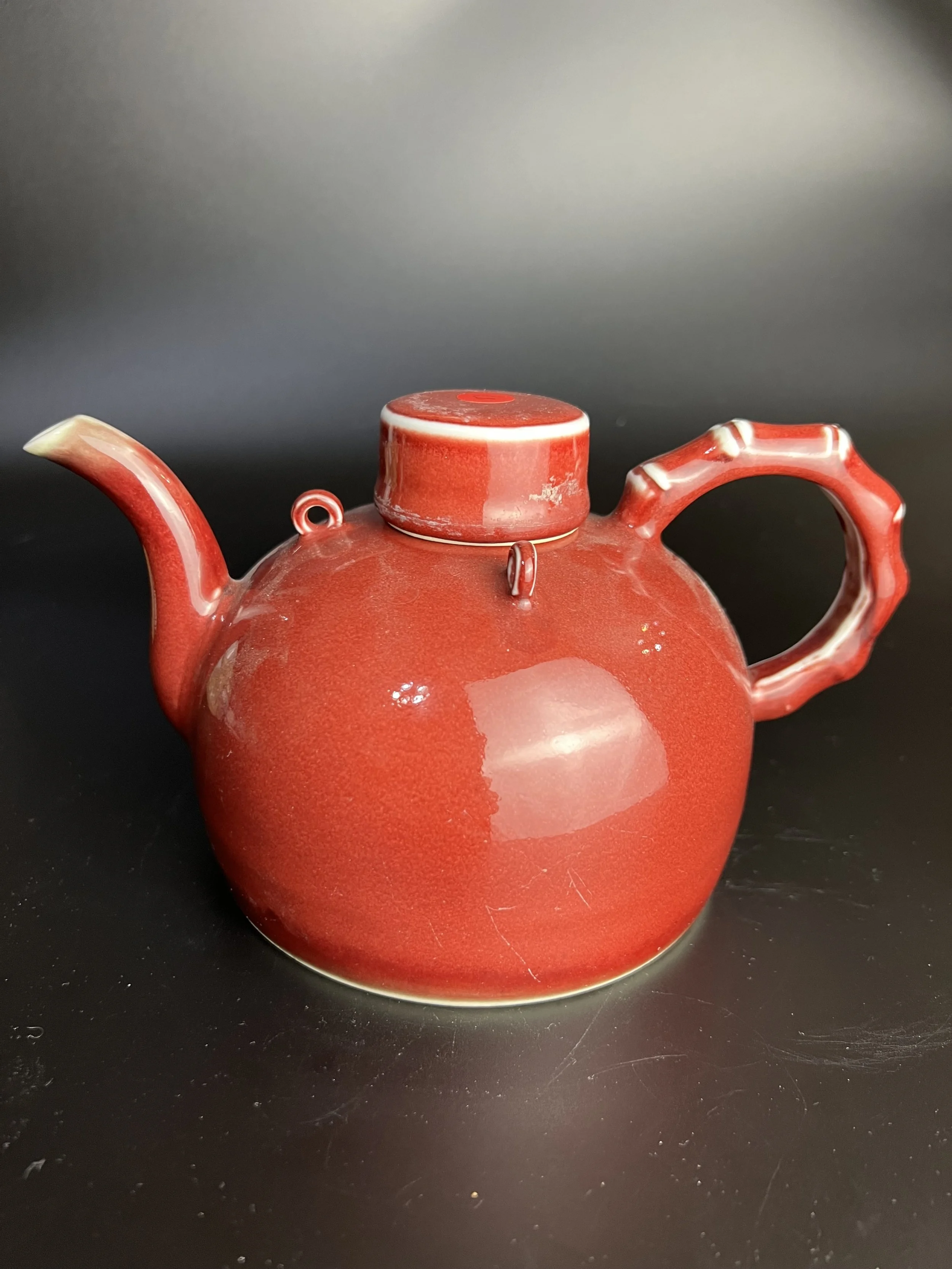 This Yongle "ox-blood red" glazed teapot with a bamboo-node handle集 top-tier glaze color, unique form,精湛 craftsmanship, and profound humanistic内涵 into a single object. It is not only a jewel in the crown of Ming Dynasty monochrome glaze porcelain but also a典范 in the history of Chinese ceramics for perfectly combining material aesthetics (red glaze), formal aesthetics (bamboo node), and spiritual symbolism (bamboo culture).