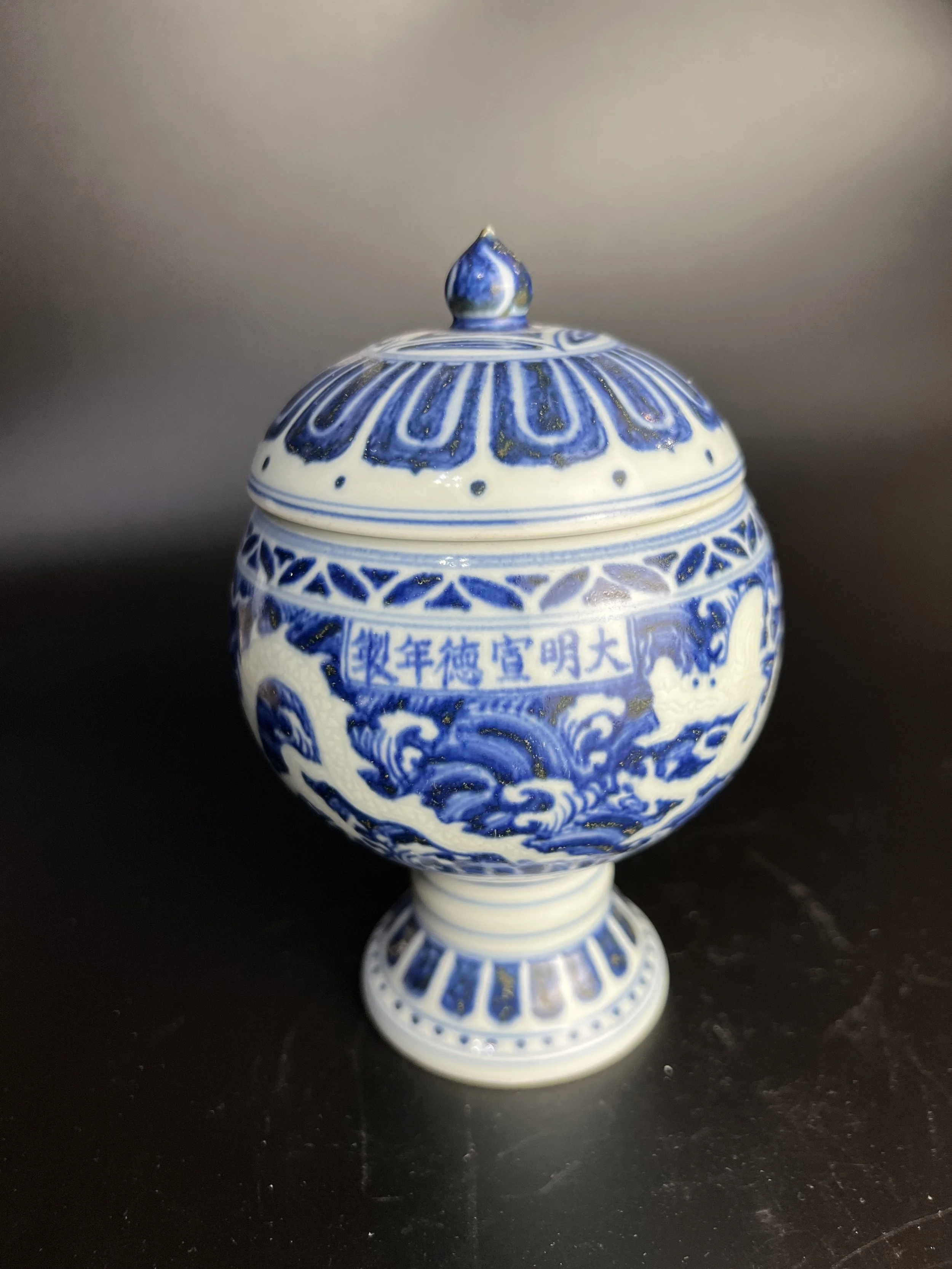 纹饰与工艺:纹饰布局层次分明,主题突出。豆腹中部为核心装饰区,以青花浓料绘就汹涌的海涛纹为地,波涛翻滚,浪花飞溅,笔触豪放而细腻,极具动感与力量。在此湛蓝的“海面”之上,以留白(暗刻)技法呈现一条矫健的白龙,龙身蜿蜒,须发怒张,穿梭于惊涛之间,仿佛破浪而出,气势撼人。这种“以青花为浪,留白为龙”的装饰手法,对比强烈,构思精妙,是宣德青花高端作品中备受推崇的技法。豆腹上下边缘及高足下部,均饰有莲瓣纹,与盖面纹饰呼应,形成和谐统一的装饰序列,亦强化了器物的宗教与礼制气息。