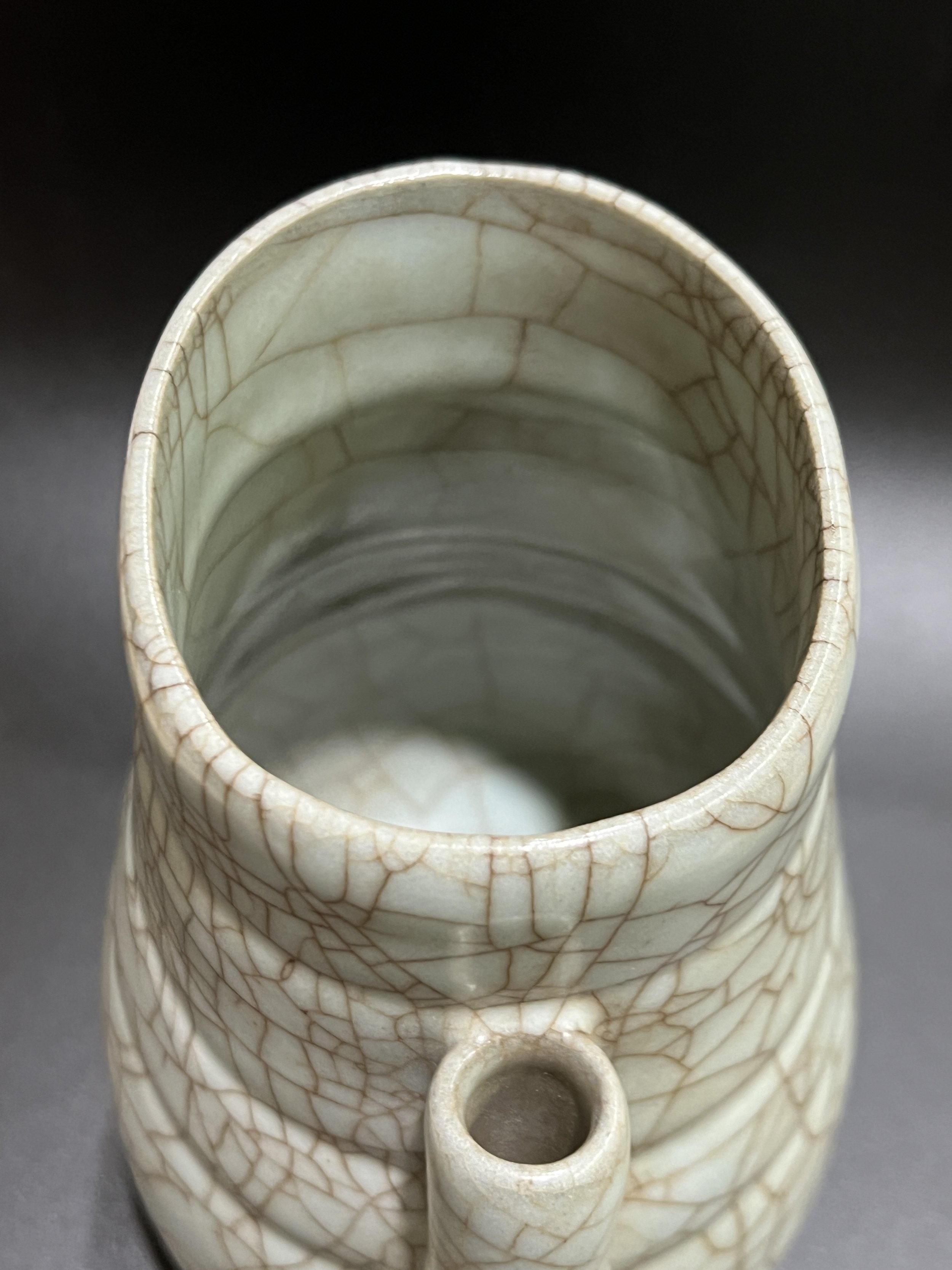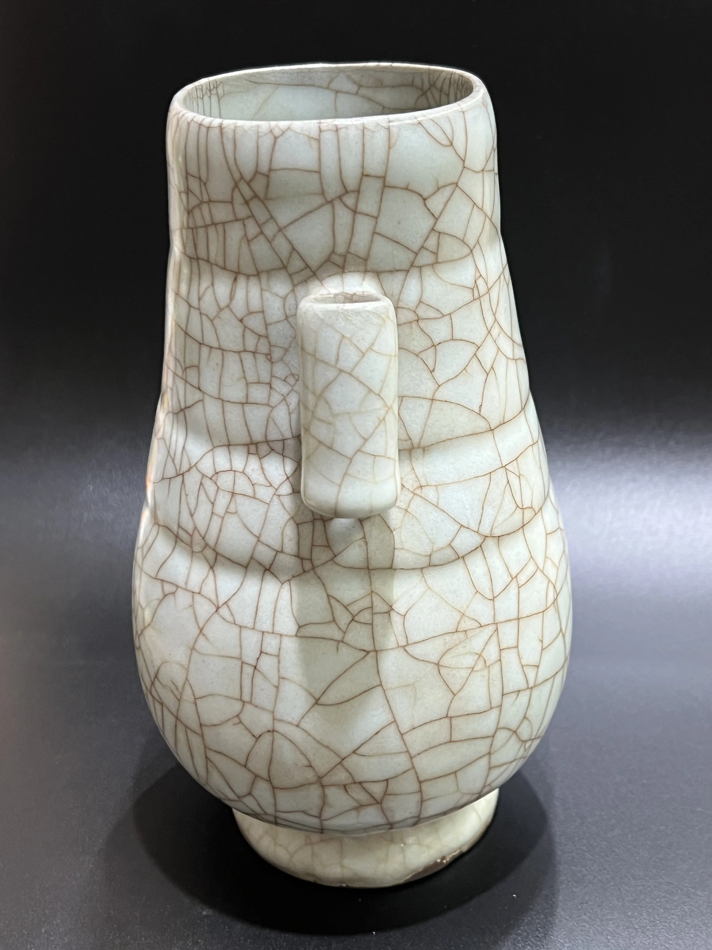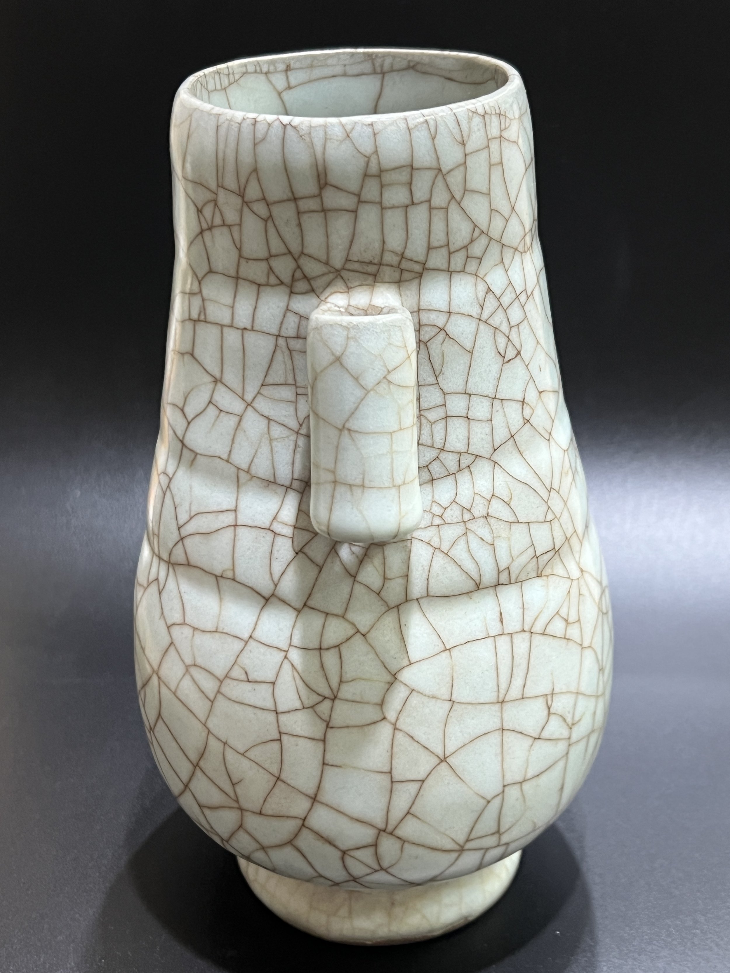 The Guan kilns of the Song Dynasty are divided into those of the Northern Song and Southern Song periods. The exact location of the Northern Song Guan kiln remains undiscovered, while the Southern Song Guan kilns were located in present-day Hangzhou, Zhejiang Province. During the Southern Song period, to meet the needs of the imperial court, two specialized kilns were established: the Xiuneisi Kiln and the Jiaotanxia Kiln, both dedicated to producing porcelain for the royal family. The everted-ear bottle's design originates from ancient bronze ewers, reflecting the Song Dynasty literati's admiration for ancient culture and the contemporary society's fondness for archaism.