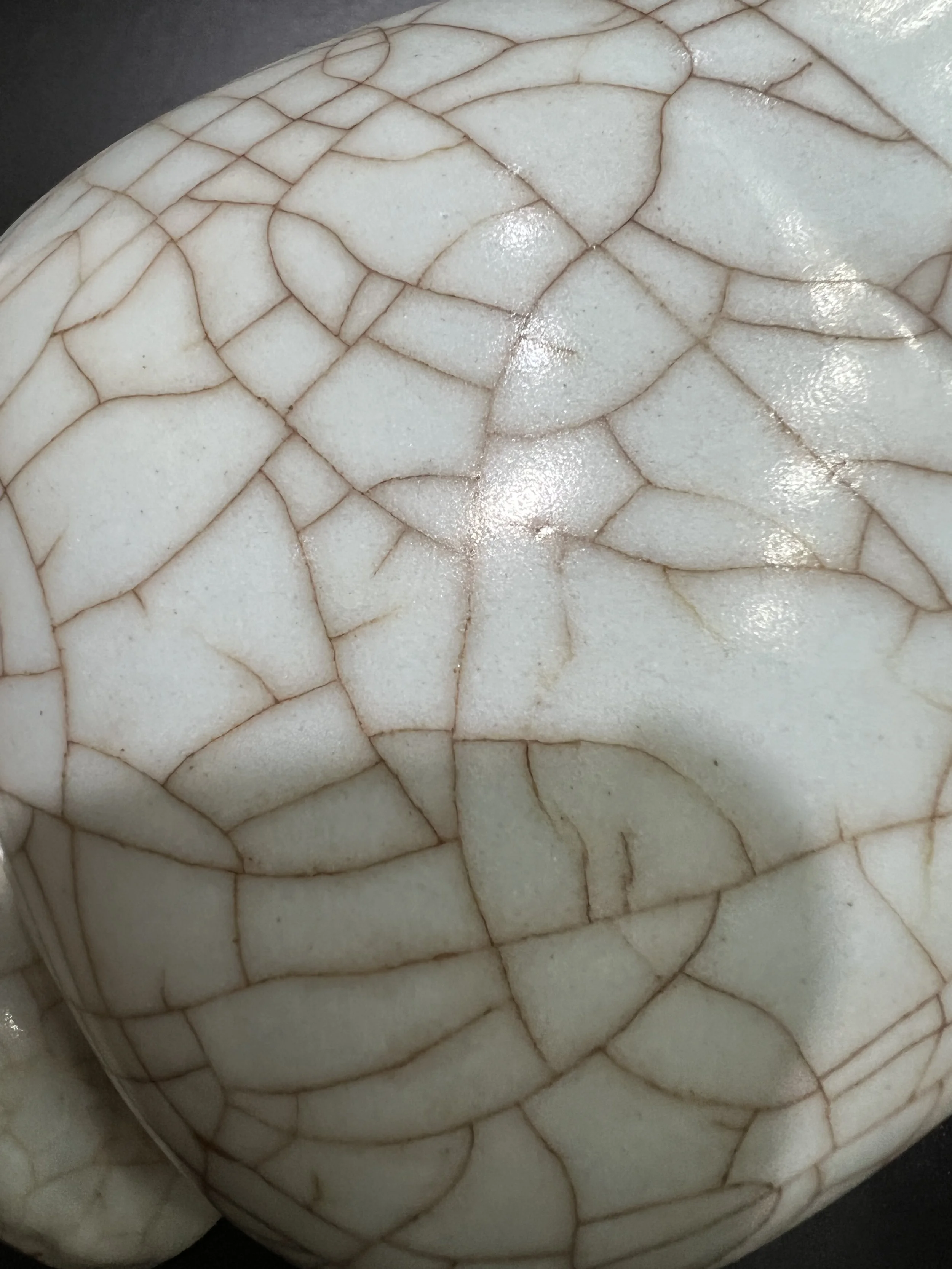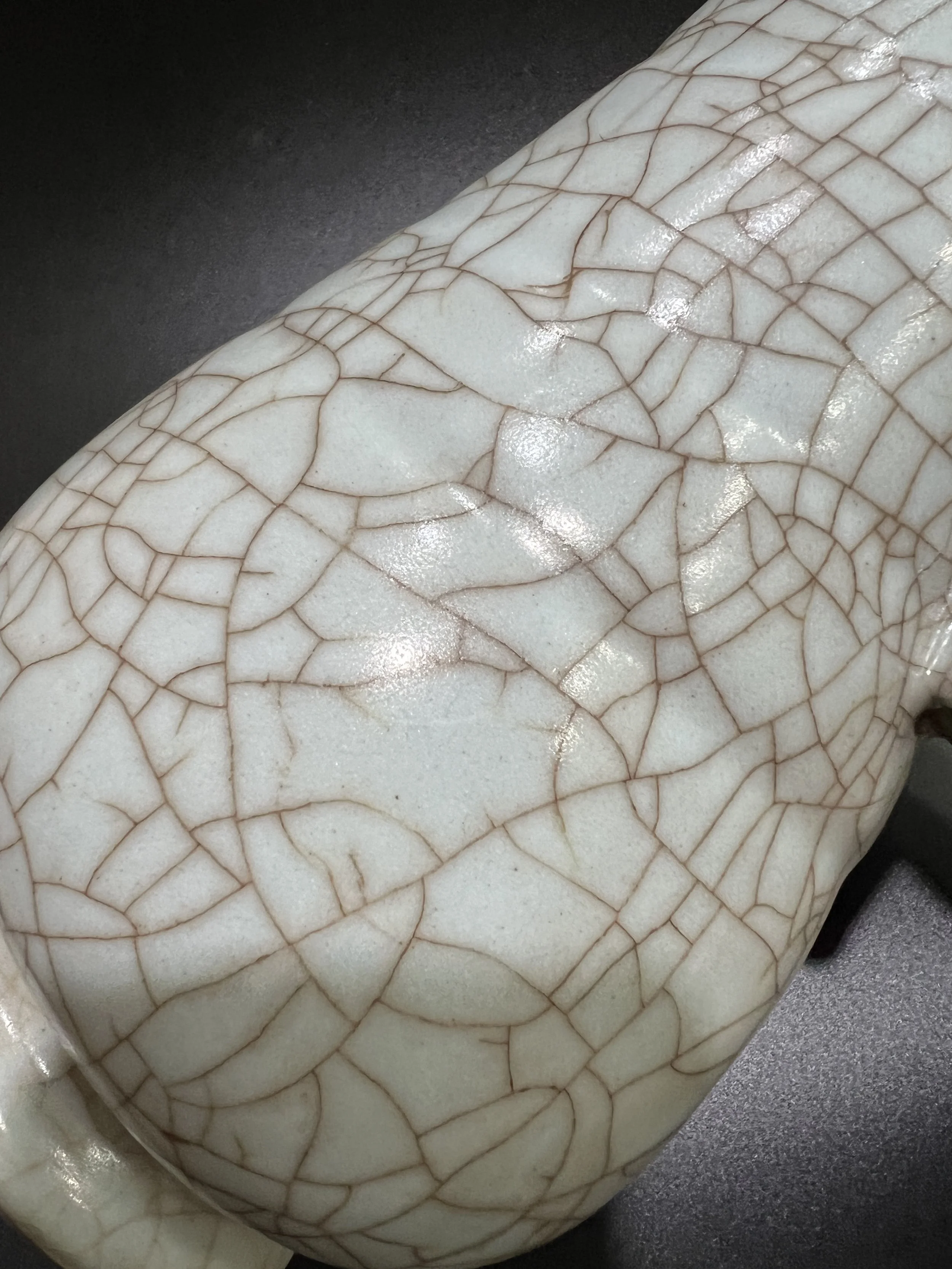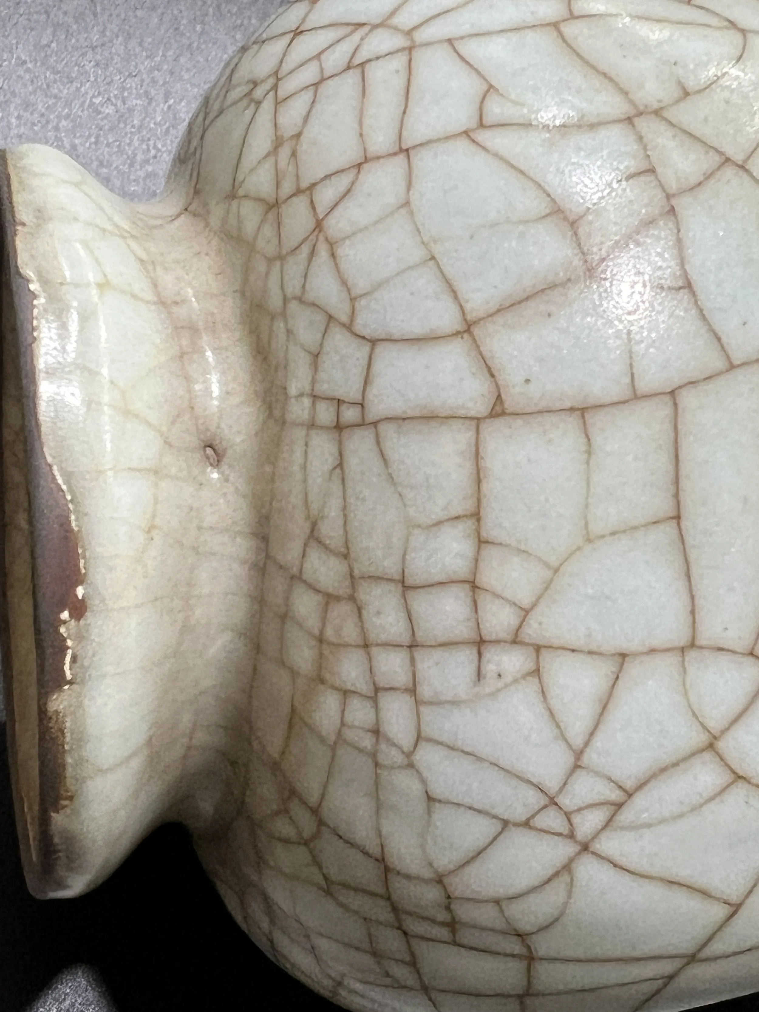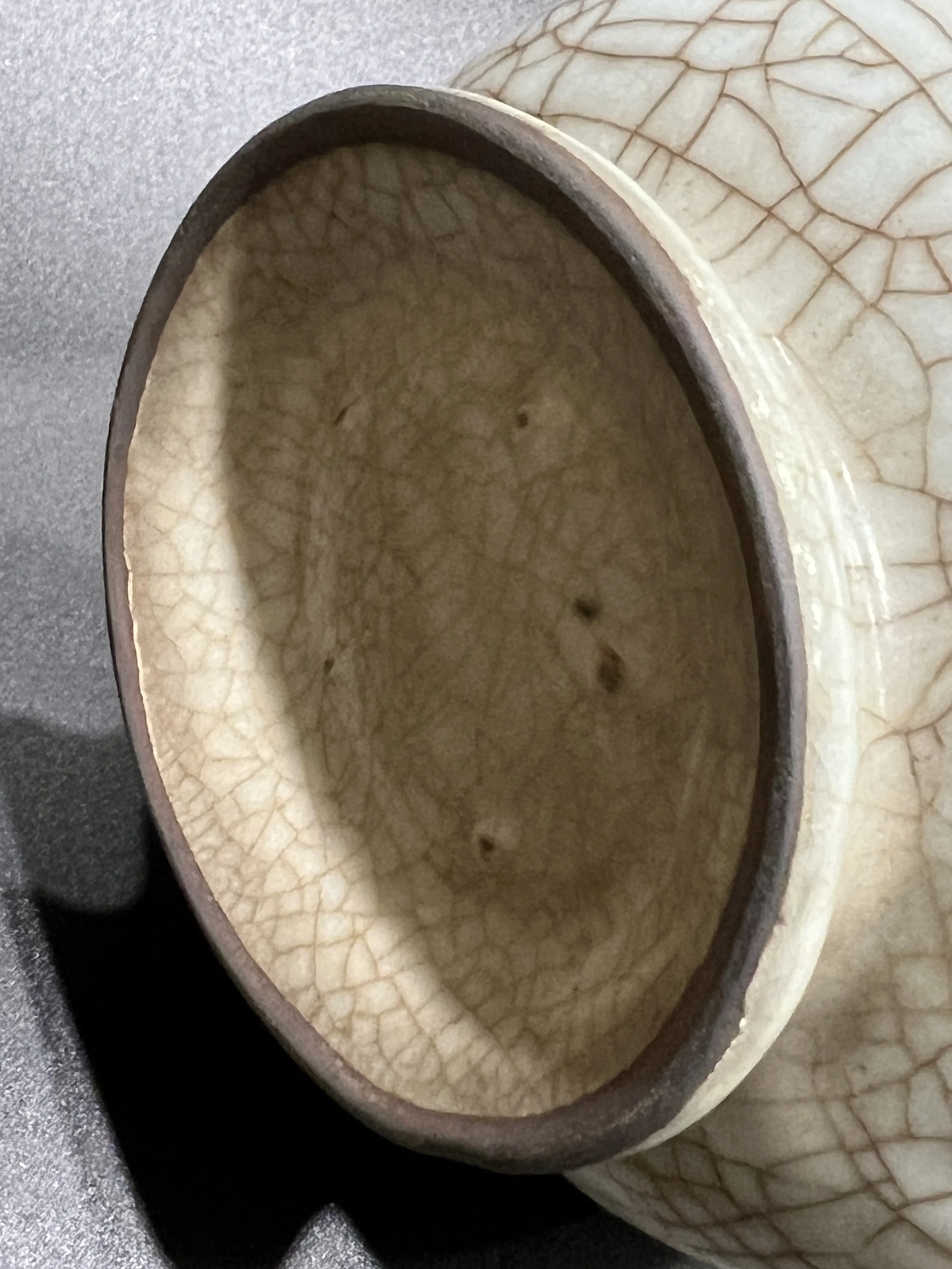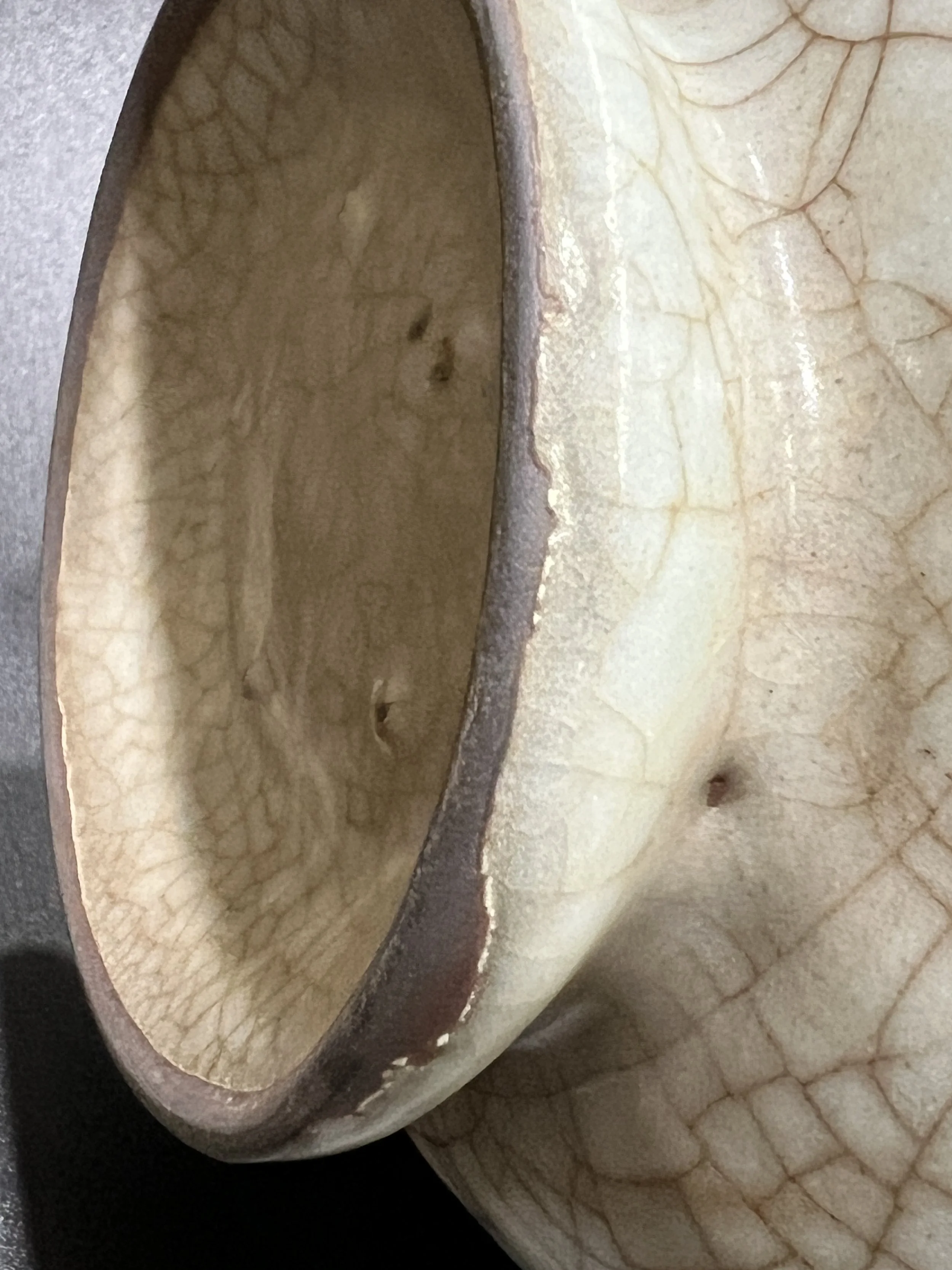 The glaze surface of Guan kiln porcelain often features crackle patterns, known as "ice crackle," which are naturally formed due to the different expansion coefficients of the body and glaze. Song Dynasty craftsmen skillfully transformed this "flaw" into a unique decorative feature. Additionally, Guan kiln porcelain is characterized by "purple mouth and iron foot," where the rim and base reveal a purplish-black body due to the thin glaze.