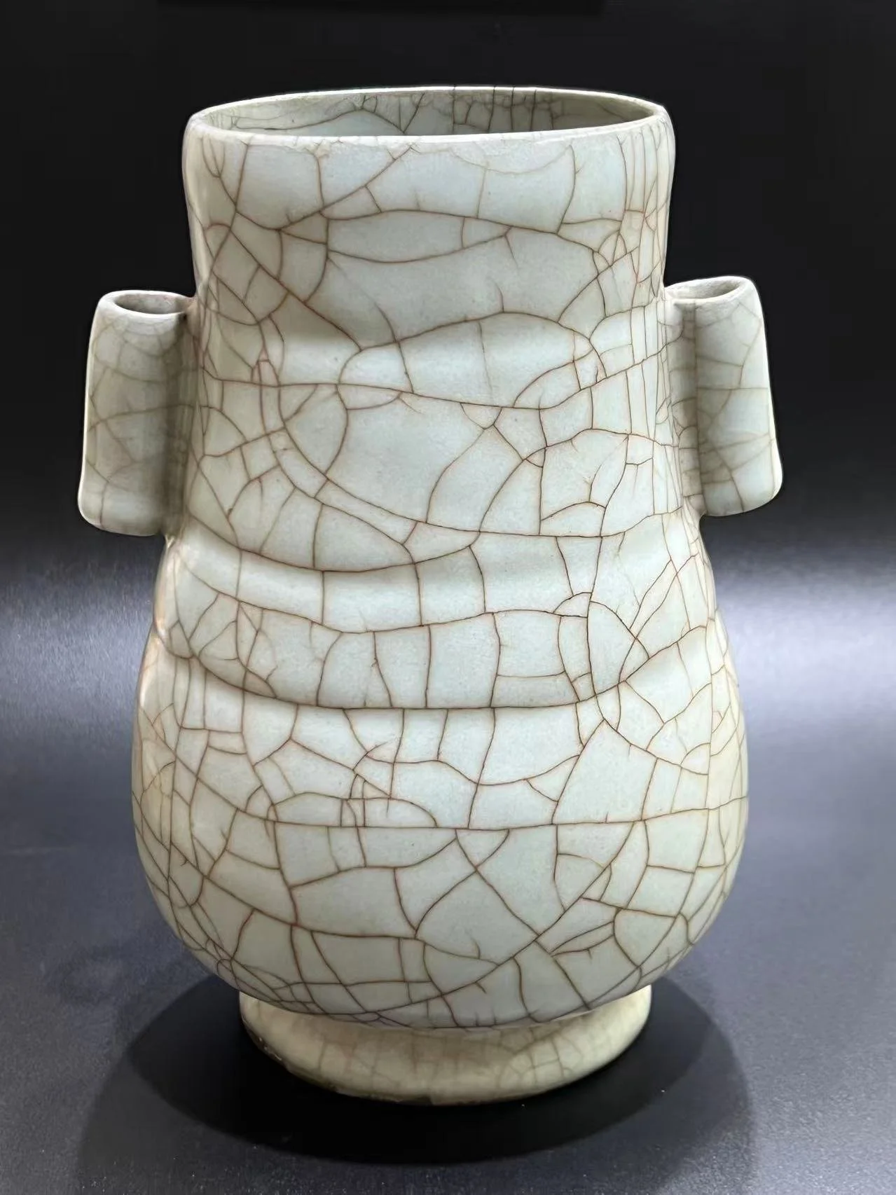 Viewing this vase quietly today, a mere twenty centimeters tall, it resembles a miniature hall of ritual. Through its archaic form with tubular handles, the mysterious ice-crackle patterns covering its body, its沉稳 iron foot with plum-blossom五钉 marks, and its unmarked minimalist confidence, it fully诠释 why Song Dynasty Imperial Kiln ware remains a millennial aesthetic典范. It is a silent ritual melody, a three-dimensional ink painting, allowing us, through it, to touch the cultural pulse and spiritual heights of that era of鼎盛风雅.